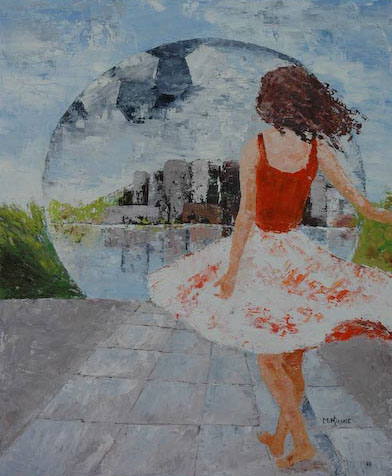 « Au pied de la Géode, sur le rebord du bassin d’où émane une musique répétitive dont la source sans cesse se déplace, une jeune femme, pieds nus, effectue des mouvements de danse très lents et appliqués.